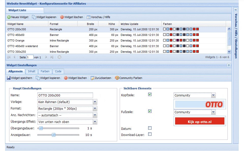 Das Widget kann dabei aber als Bannerersatz in den verschiedenen Größen von Full-Size bis hin zu Skyscraper anstelle herkömmlicher Banner als Werbemittel eingeblendet werden und unterstützt das publisherseitige Logging von Views und Clicks. Die Anpassung an das Layout, die Auswahl der passenden Größe und die Auswahl der Themenkänale aus denen das Widget seine Nachrichten bezieht, werden über eine einfache Konfigurationsseite für den Publisher bzw. den Affiliate vorgenommen.